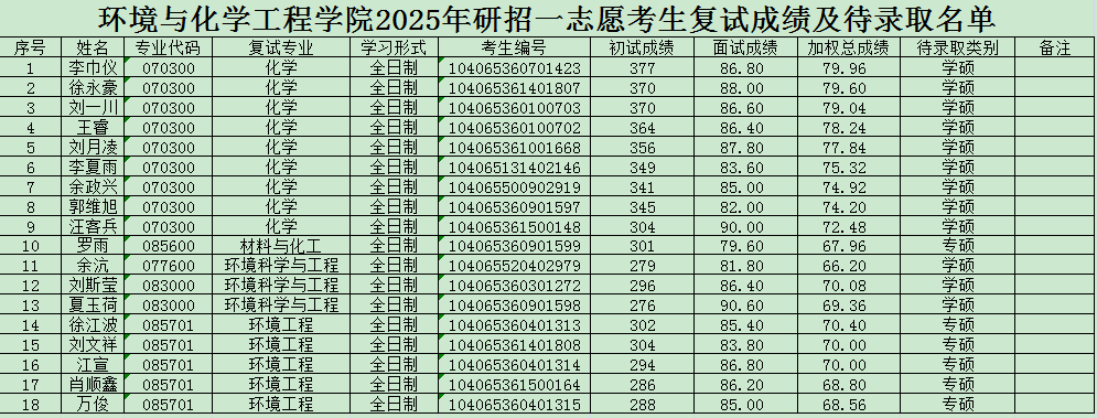 环境与化学工程学院关于公布2025年研招一志愿考生复试成绩及待录取名单的通知