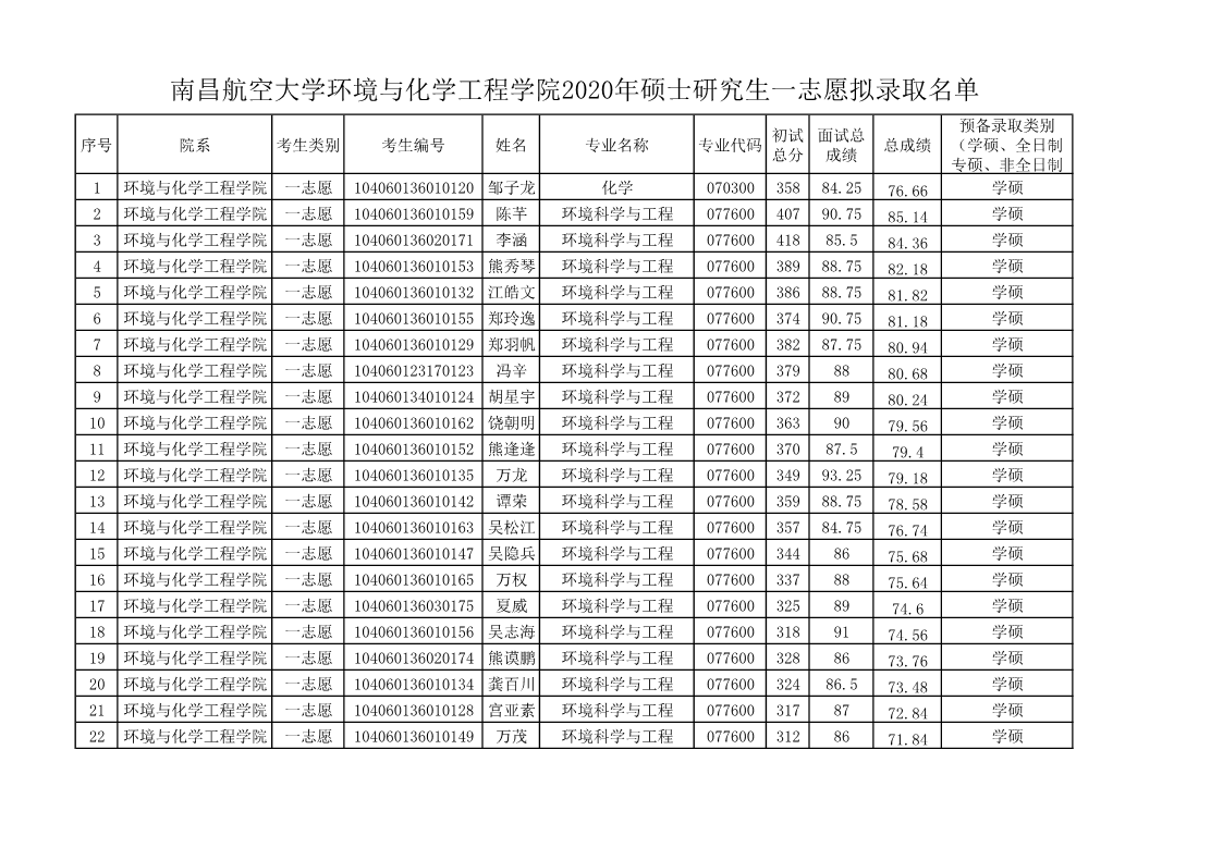 南昌航空大学环境与化学工程学院2020年硕士研究生一志愿拟录取名单